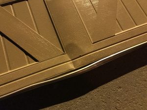 Tom and his family bought their beautiful, brand new house in Queen Creek, Arizona in November of 2016. Not even one year in, they found themselves needing a whole new garage door. The cause? Well, Tom’s door blew inward during one of Arizona’s raging hurricanes of 2017. Okay, let’s be honest, that was an exaggeration, we all know that our Arizona storms should not be blowing in brand new garage doors! The real cause was that the builder of Tom’s home used the absolute cheapest garage door we have ever seen. This door had the thinnest metal a company could possibly get away with (learn about garage door metal gauges here), L-shaped stiles with minimal glue (learn about stiles here), and most importantly, a thin, flat bottom extrusion which buckled under moderate wind (learn about bottom extrusions here). All of the cutting-of-corners in the manufacturing of this door, combined with the flat bottom extrusion, caused the door to be a complete loss as a result of very common Arizona winds. This was the point of failure on Tom’s garage. Because the bottom extrusion was flat and not L or U-shaped, the winds caused it to quickly fail and bend inward, and the rest of his door was history, rippling upward and causing irreparable damage to the other sections of the door.
